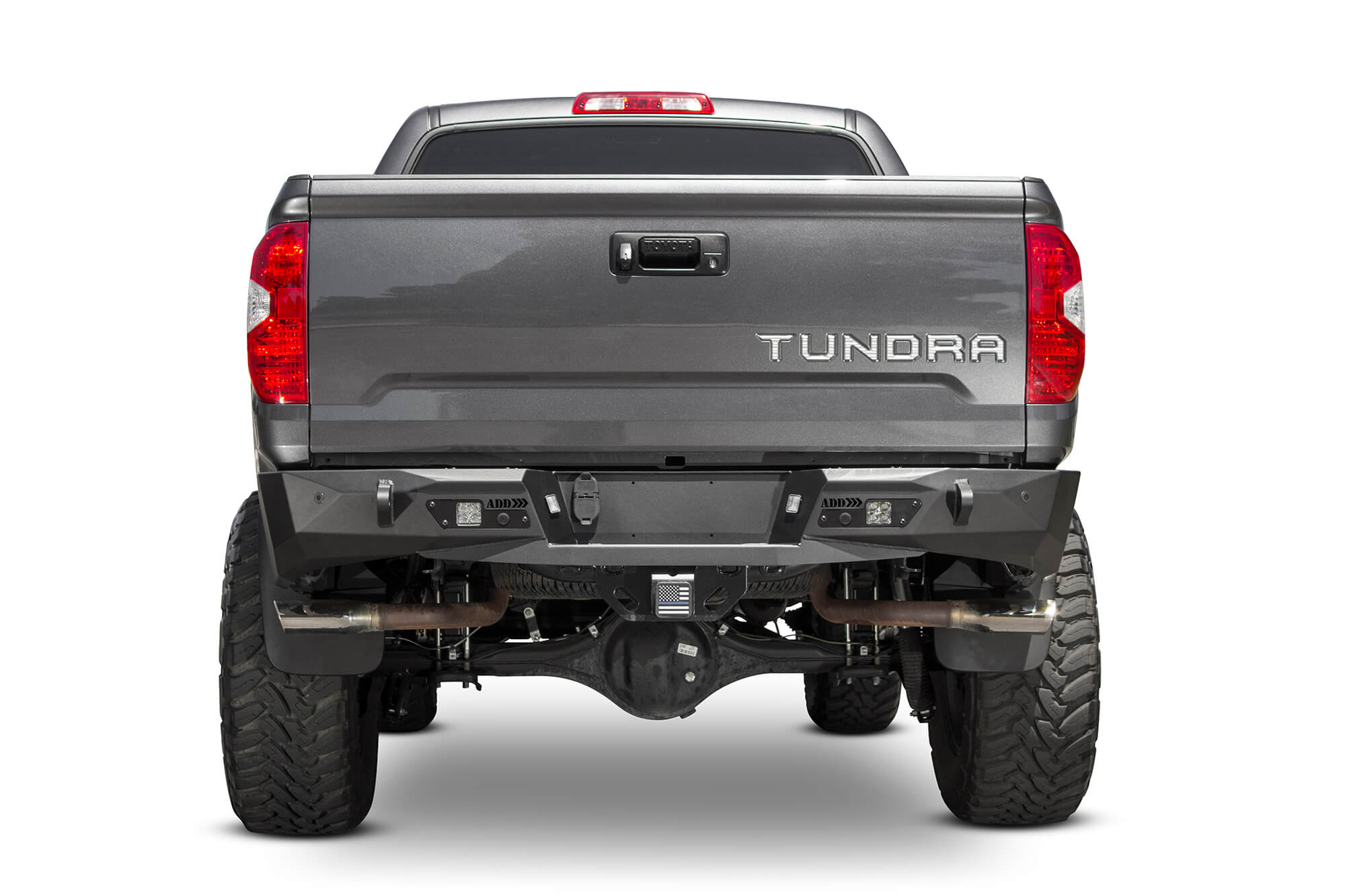 Addictive Desert Designs Stealth Fighter rear bumper for the Toyota Tundra is a slim steel plate design that adds protection without adding size or bulk to your truck.