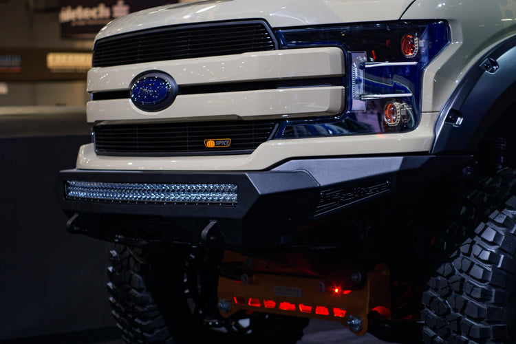 The center of the bumper has a universal light mount system that allows you to mount up to 10 cube lights or a 40" radius or straight LED, or anything in between to give your F-150 the additional lighting setup that you need. Additional mounts for 10" SR LEDs behind the side panels give your truck even more lighting options.