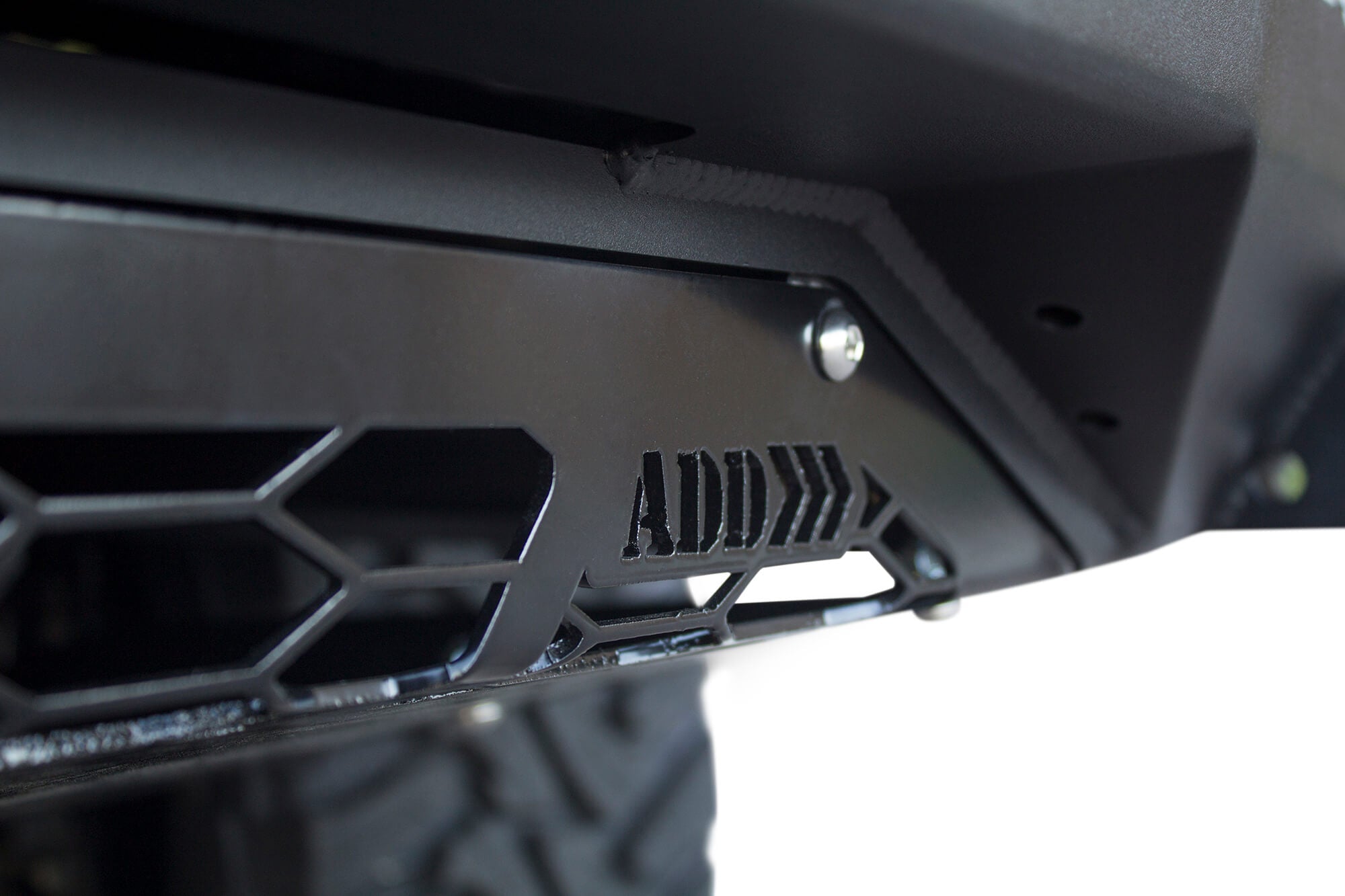 Addictive Desert Designs Stealth Fighter front bumper for the Ford F-150 is one of our tightest fitting and most aggressive looking bumpers on the market. A modern radius plate design allows the Stealth Fighter to keep a tight fit around the front of your truck to match the factory design, while giving you the added protection of a steel plated bumper.