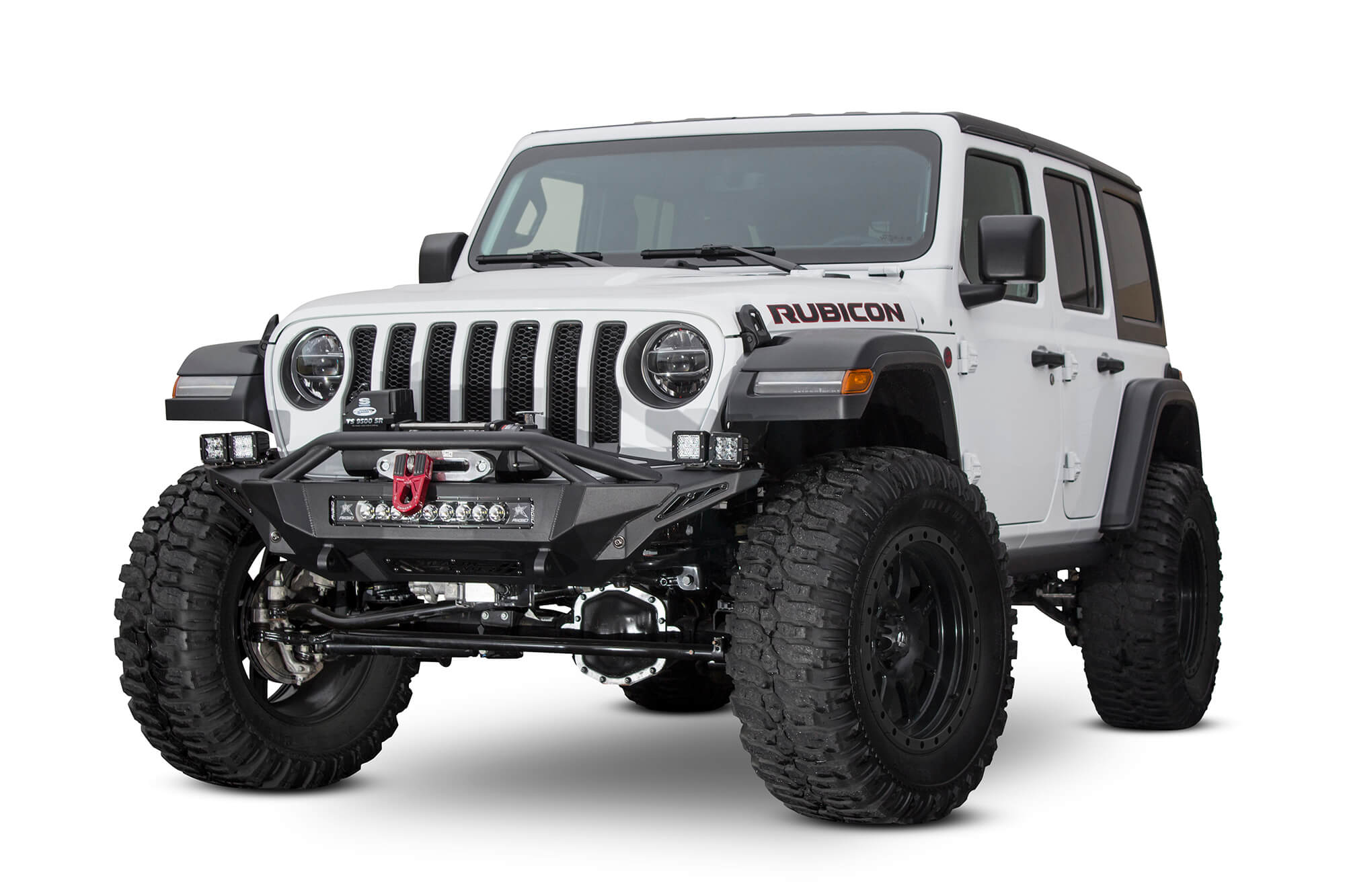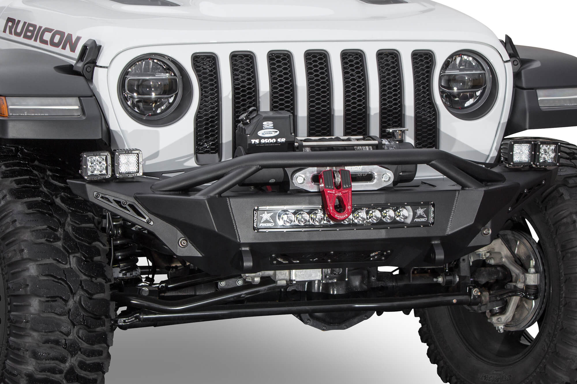 Transform the frontend of your Jeep Wrangler JL or Jeep Gladiator JT with the Stealth Fighter winch front bumper. A radius plate steel construction gives your Jeep JL/JT the perfect combination of strength and style. A patented universal light mounting system in the center of the bumper allows you to mount any size and brand of light up to a 20" radius light bar or 5 cube lights.