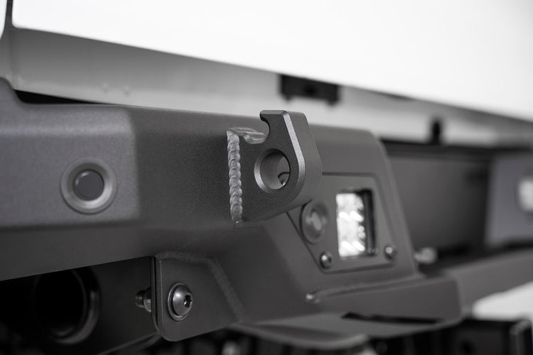 Two rear facing cube light mounts come standard with the Stealth Fighter. Full OEM features such as parking sensors are retained, and integrated reinforced clevis mounts accept soft shackles for added utility.
