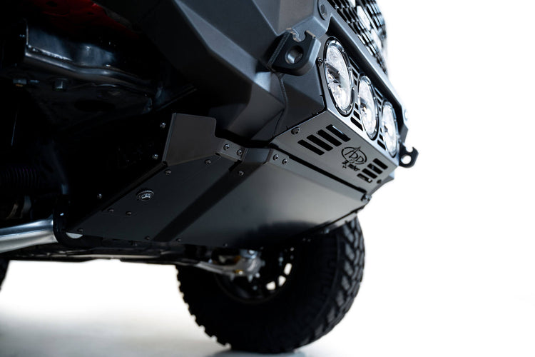 The Bomber is a tight fitting front bumper for the new Bronco, that follows the contours of the body perfectly. At the center of the bumper, is a satin black aluminum panel that frames 3 mounting points for Rigid 360 6-inch lights (also available with Baja Designs Lighting. At the sides of the bumper are mounting points for cube lights, framed by satin black aluminum panels. The Bomber is constructed from modern plate steel, finished in a hammer black powder coat. The aluminum panels are finished in a satin black powder coat.