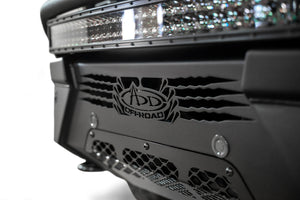 The newly redesigned Addictive Desert Designs HoneyBadger Front Bumper keeps the same rugged styling as the original but with a low-profile fitment. There is an optional top hoop, but either configuration has room to mount a radius 30" light bar on top of the bumper. The center of the bumper houses a straight 20" light bar, and two cube lights can be mounted behind the side panels.