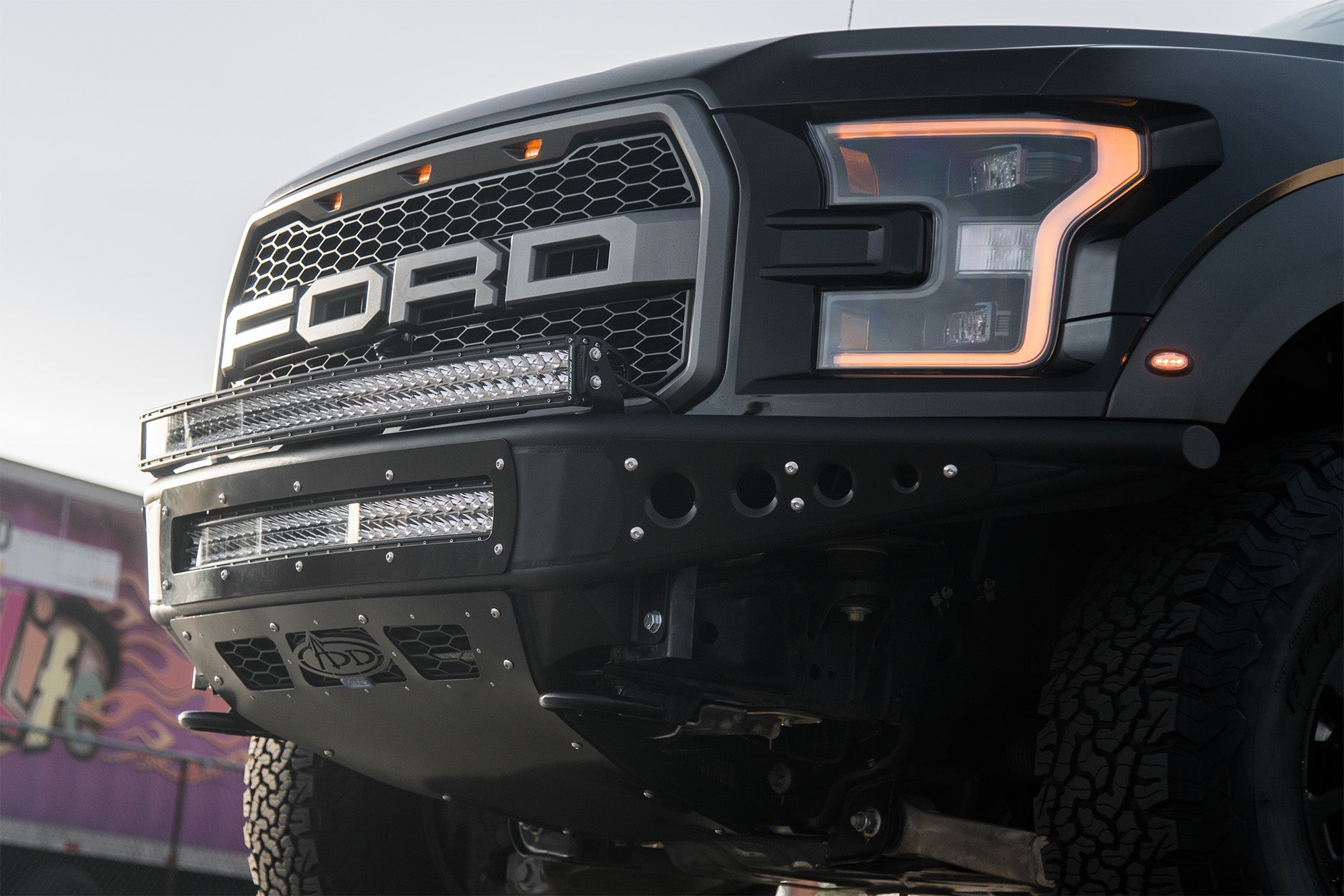 The Ford Raptor Venom R Front Bumper features the ADD Offroad universal light mount system in the center of the bumper, allowing for up to 8 cube lights or a 30" Radius LED bar to be mounted. Mix and match any brand and size lights with the universal light kit to create the perfect lighting combination for your needs. Additional lighting options are available on top of the Venom R bumper accepting up to a 40" Radius LED or 10 cube lights.