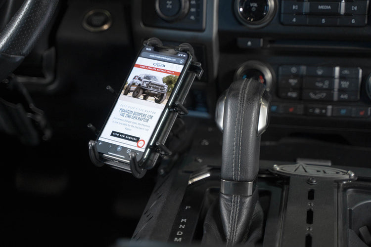 Our F-150/2nd Gen Raptor/Super Duty Center Console Molle Panels & Digital Device Mount were designed to bring utility to the cab while complementing the OEM interior styling. The kit includes driver & passenger side molle panels, perfect for stowing everyday carry items like a holster, multi-tool, radio mic, & other gear. The molle is compatible with various attachment systems such as molle mounts, straps, ¼-inch bolts, or other tactical solutions.