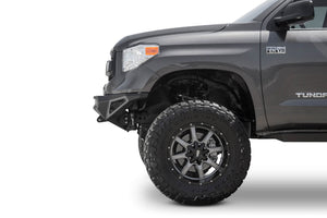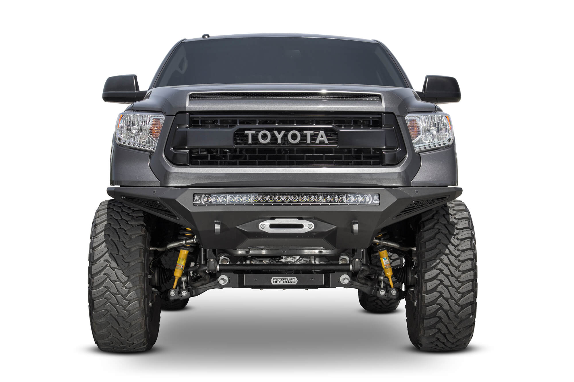 Addictive Desert Designs Stealth Fighter front bumper for the 2nd Gen Toyota Tundra is an aggressive modern radius plate design that fits tight around the Tundra's frontend. A steel plate design provides additional protection and a winch mount provides additional utility for your truck.