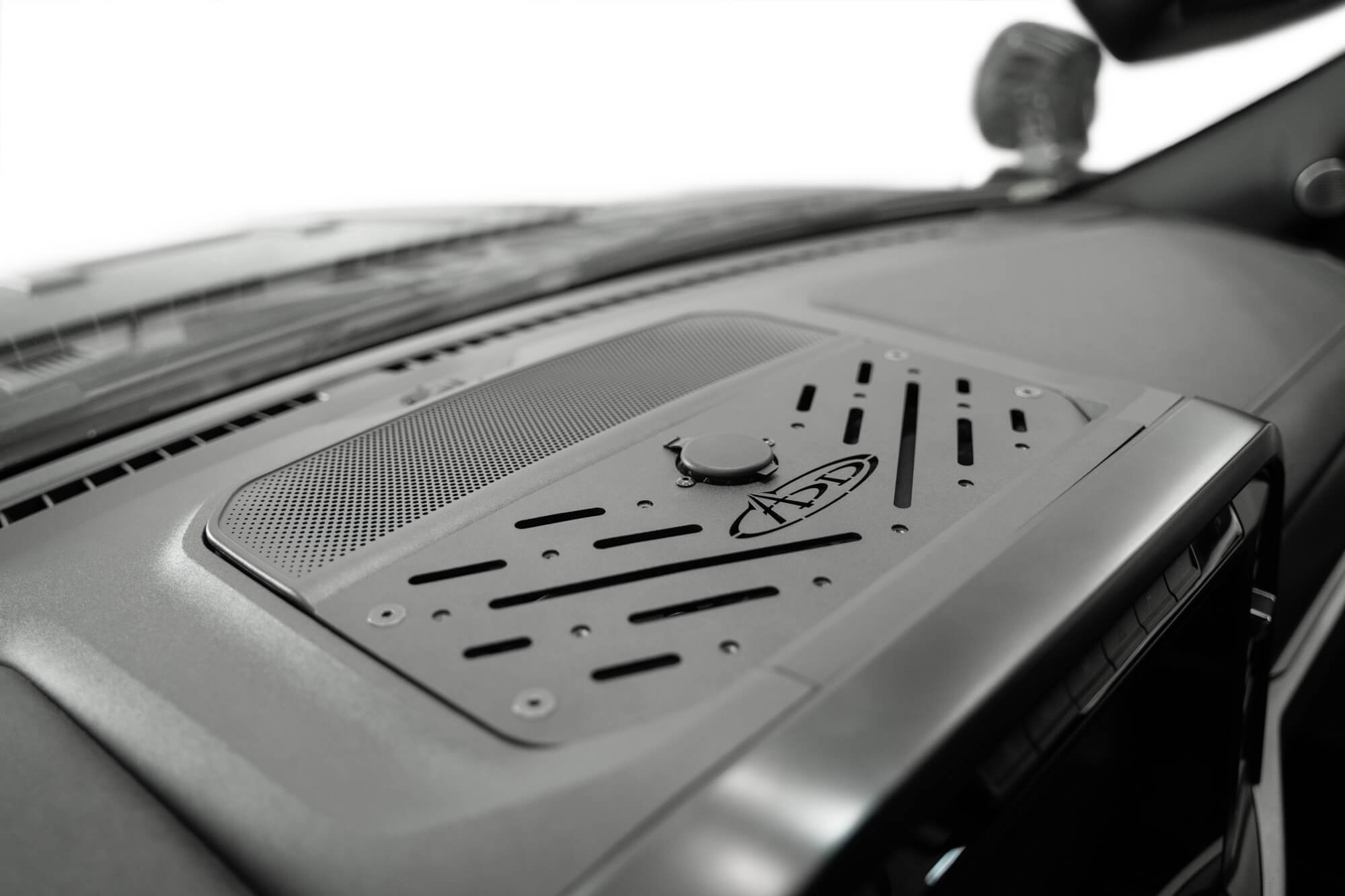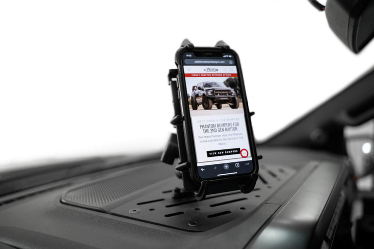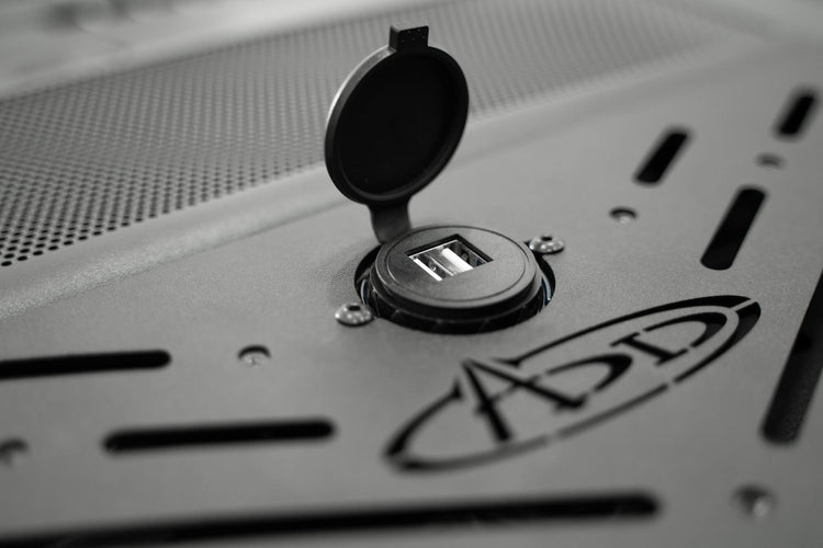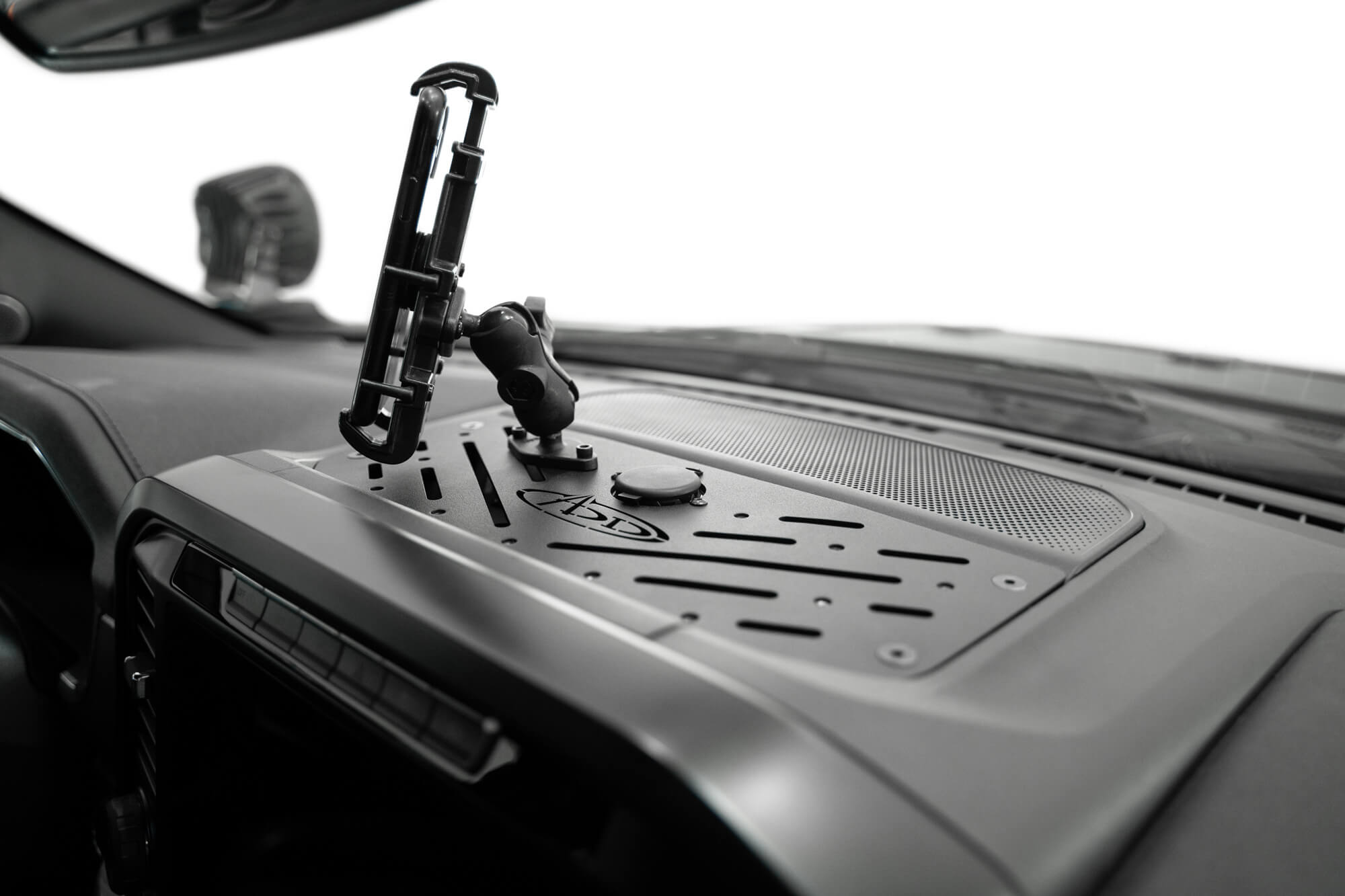 Accessibility to communication, navigation, and information while on the road or trail is vital. Keep your handheld devices within reach with our 2021+ F-150 & 3rd Gen Raptor Digital Device Dash Mount. Finished in a durable 2-stage black powder coat, the contoured plate mounts in F-150 dash cubby and complements the interior styling. It was designed for compatibility with RAM Mounts device holders as well as other brands. This solution is ideal for mounting smartphones, tablets, GPS, action cameras, and other digital devices. At the center of the plate are dual 12V USB charging ports to provide additional charging opportunities when running multiple devices. As always, this is Made in America.