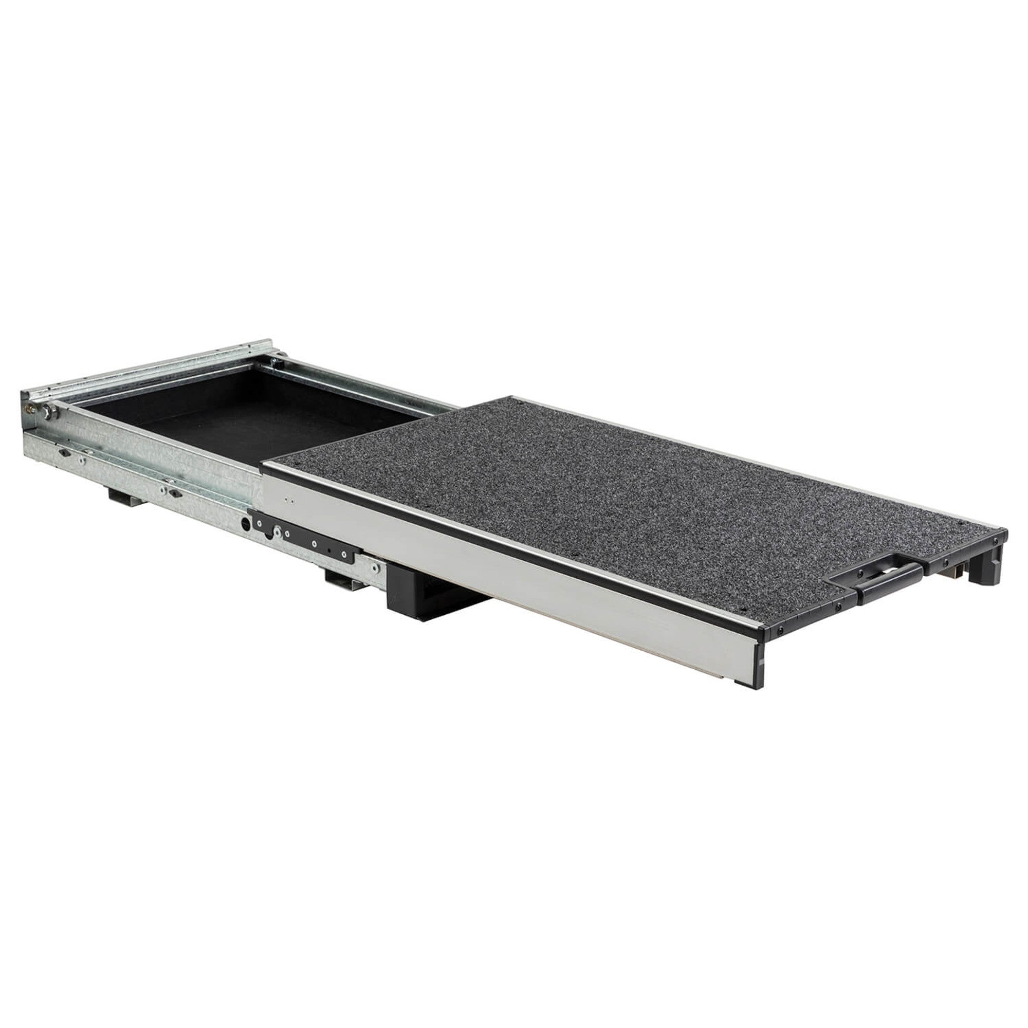 Roller Floor is a fantastic new product. The Roller Floor sits only 140 mm off the vehicle floor, enabling lower mounting and easier access to items such as fridges or tool boxes. The Roller maximizes storage space with an incorporated slide out tray. When not housing a refrigerator, the Roller Floor has a flat top thats far more convenient to sit other items on than a traditional steel fridge slide. Ever tried to sit your groceries on top of a traditional fridge slide? ;