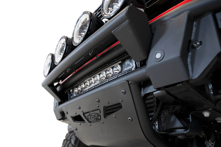 The ADD PRO Bolt-On Front Bumper for the 2021-2023 Ford Bronco was designed with the lowest profile fitment possible without having to cut your frame. The upper radius .120-inch wall steel tube tightly follows the contours of the front end, and is joined to steel plating and additional steel tubing at the middle of the bumper. An 1/8-inch vented aluminum skid plate extends towards the undercarriage to provide protection below. The venting in the skid plate ensures proper airflow to the intercooler.