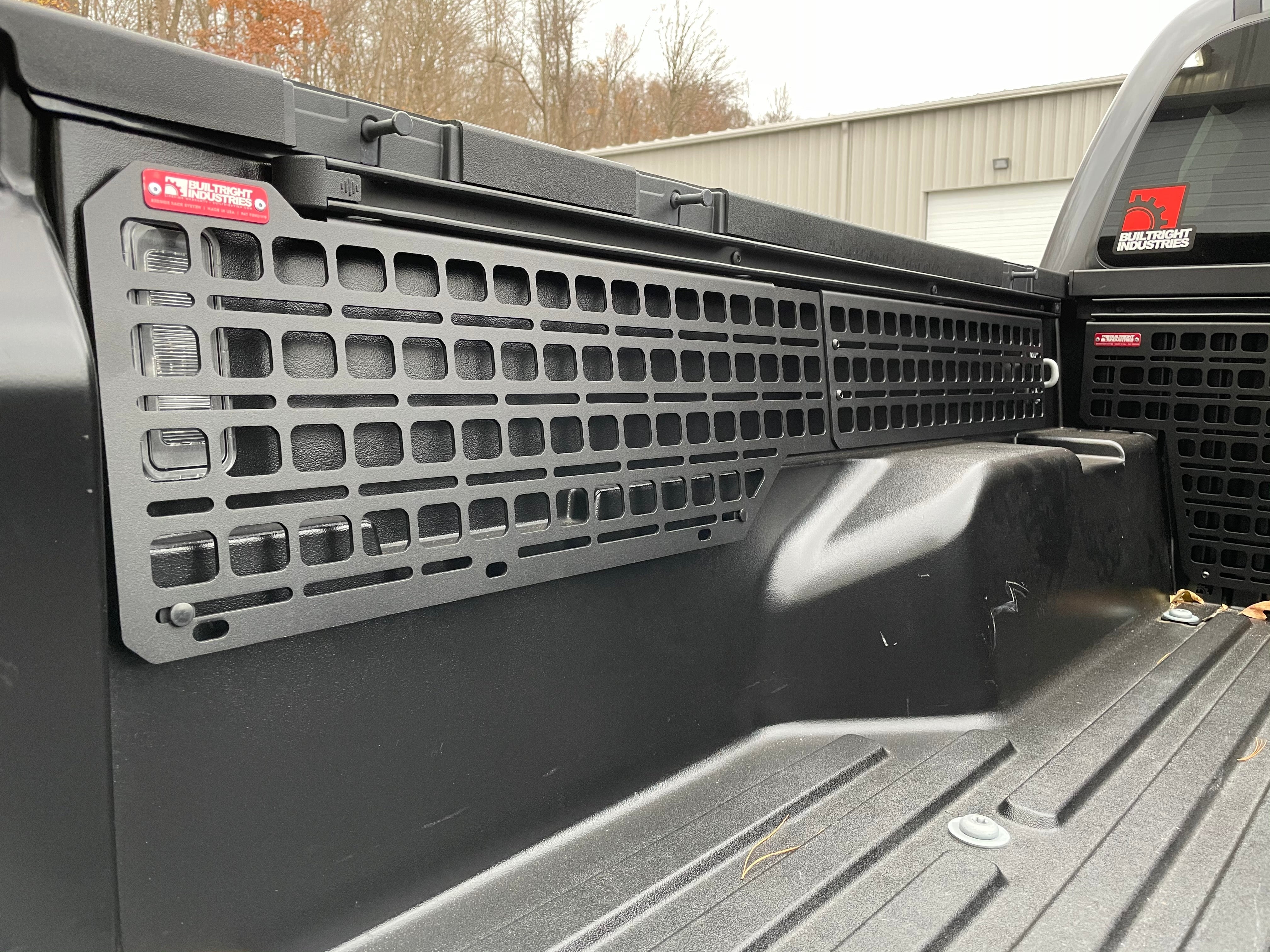 Toyota did us the great favor of offering the Tacoma with utility rails on both sides with an optional rail at the cab wall. Unfortunately, these rails offer limited use without a variety of brackets and attachments. The BuiltRight Modular Bedside Rack System installs using these same factory mounting points, without the need for modification to the vehicle and leaves the utility rail completely unobstructed and available for use. The panels provide MOLLE-compatible features for the use of MOLLE/PALS accessories in addition to universal slots for an infinite number of possibilities. The growing selection of custom attachments offered by BuiltRight will help you secure a wide variety of gear, but these slotted features will also allow you to bolt just about anything to these panels.