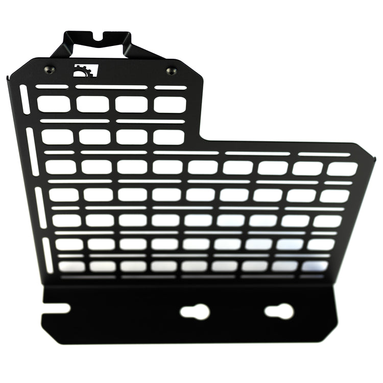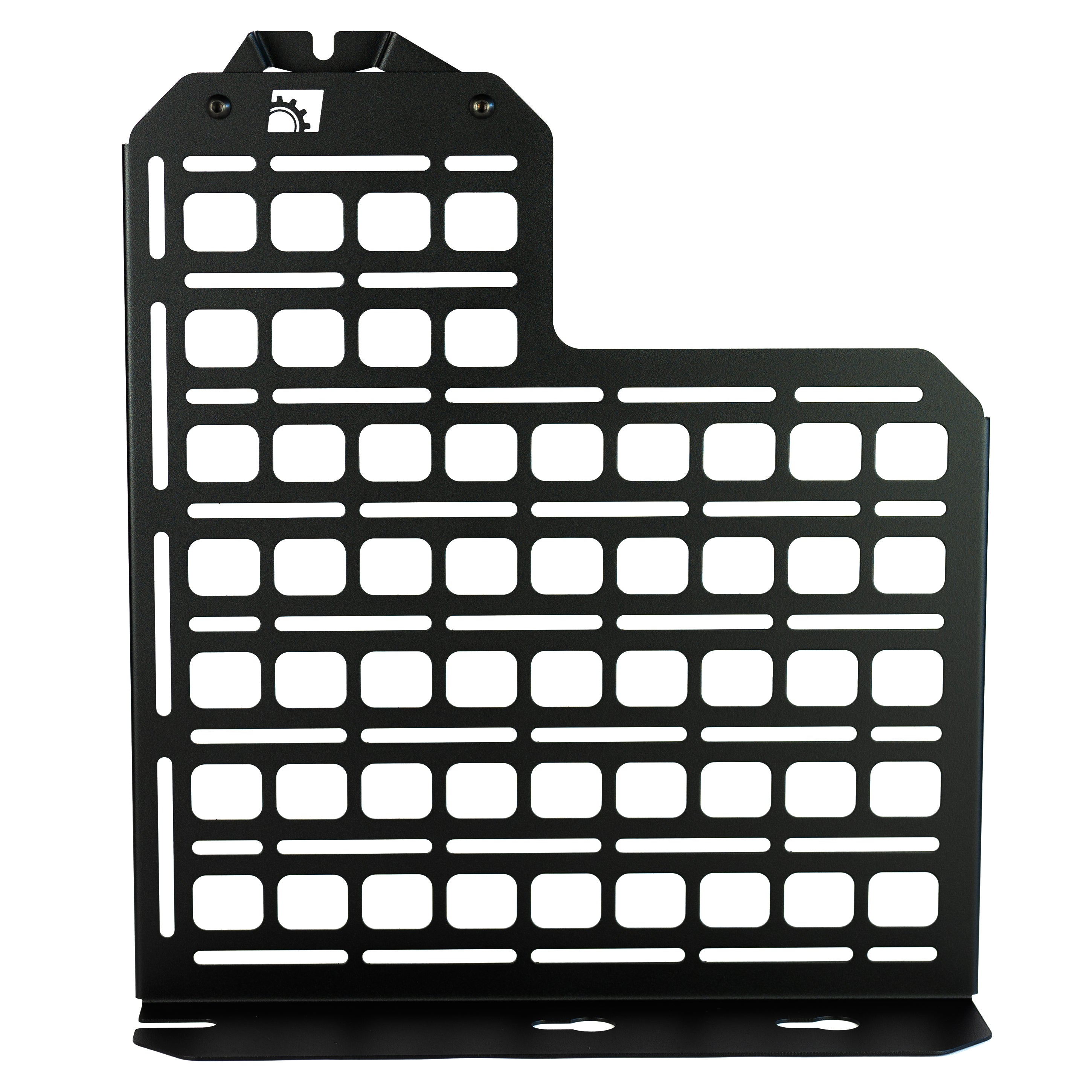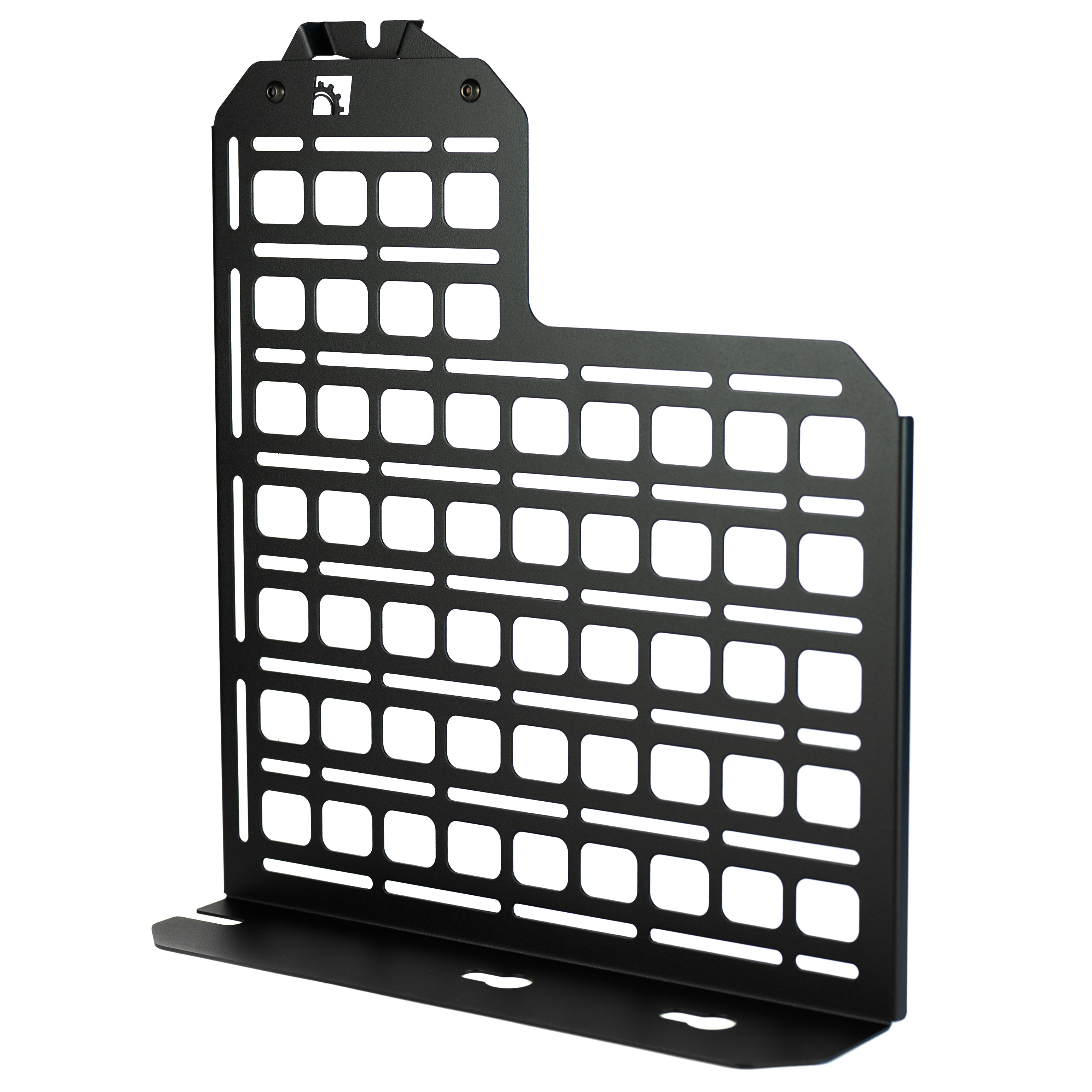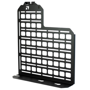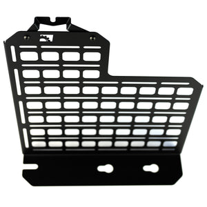 This panel is designed to mount behind the rear passenger seat of your F-series truck, replacing the factory jack but providing a location to mount equipment/gear/tools. Each piece is laser cut from 16ga mild steel and then finished with a durable texture black powdercoat.