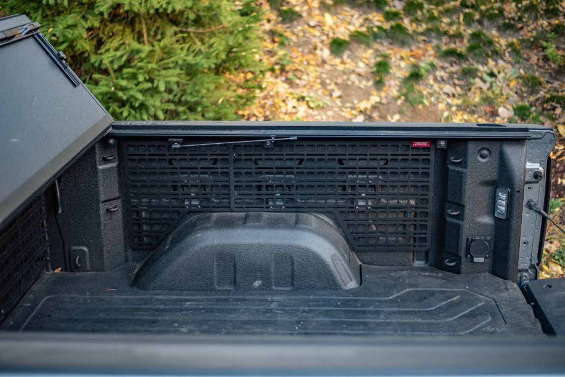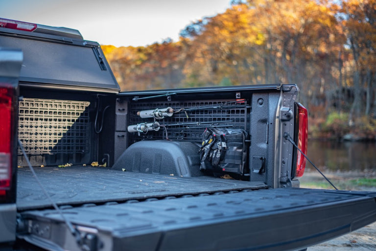 In the 2019+ GMC/Chevrolet lineup, each truck bed is equipped with three oval shaped holes in the bedside. Used along with the tie down loops near the front and rear, the Silverado and Sierra is very well equipped to support a full length MOLLE panel system. The BuiltRight Modular Bedside Rack System installs using these factory mounting points, without the need for modification to the vehicle. The panels provide MOLLE-compatible features for the use of MOLLE/PALS accessories in addition to universal slots for an infinite number of possibilities.