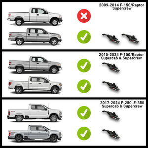 2015 - 2024 F-150/Raptor Supercab and Supercrew: These models store OEM tool kit behind the passenger side seat and use one latch release kit for the driver's side.
