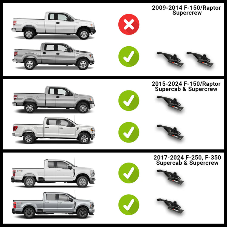 2017 - 2024 F-250 and F-350 Supercab and Supercrew: These models will utilize a single kit on the driver's side.