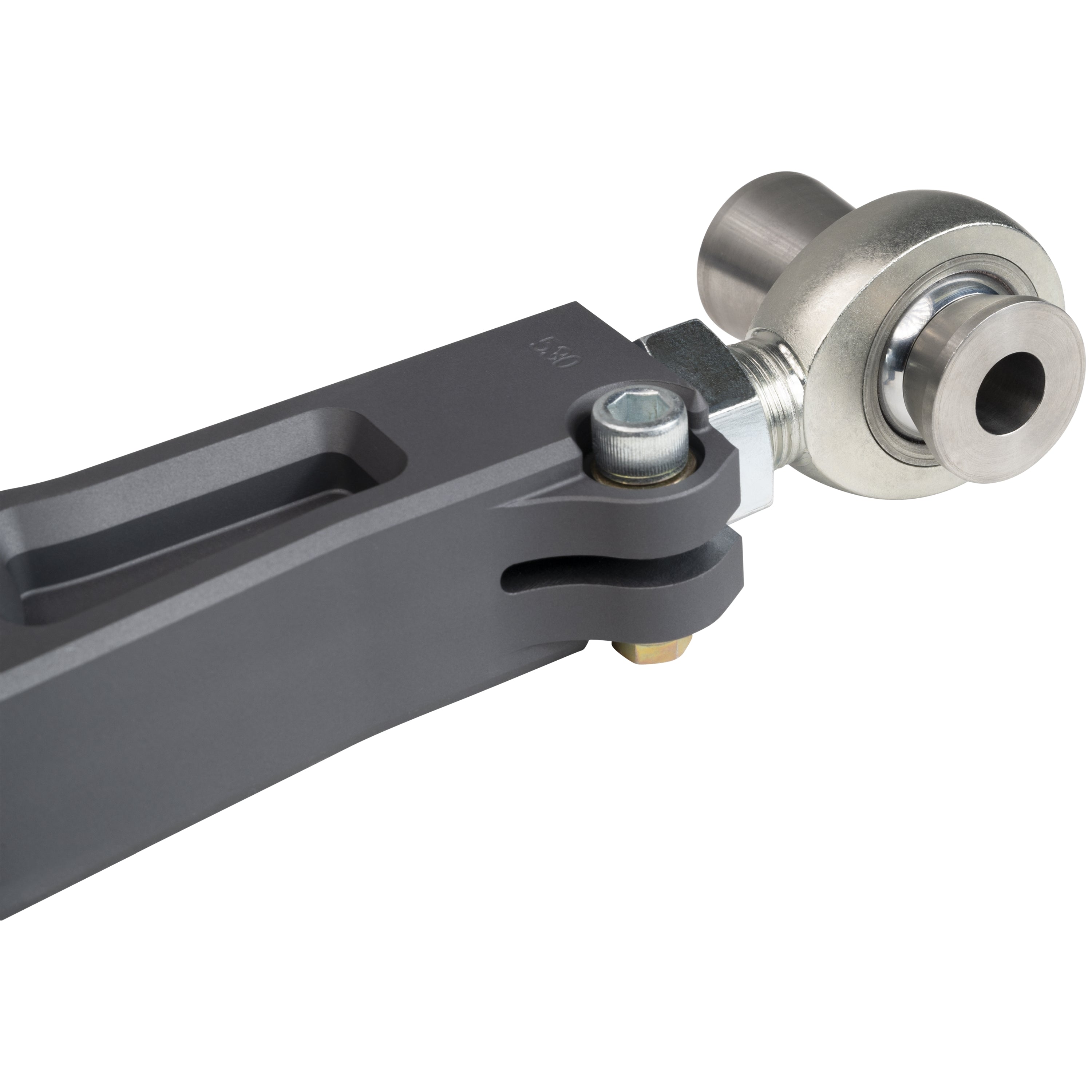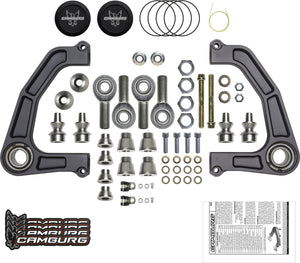 Countless hours were spent designing and refining these arms to the point where they met our high standards. CAD designing and machining gave us the ability to bring some new design elements and features to the table. We CNC machine these from aerospace quality 6061 billet aluminum, then send them out to be bead blasted, Type II anodized blue and have our Camburg logo laser etched. Like our tubular arms we use a larger FK 1.25” uniball that has a PTFE liner for increased strength and mis-alignment for maximum useable wheel travel. Made in the USA these are far superior to the cheaper and smaller imports other companies use. Adapting the uniball to the spindle/knuckle is done using model specific spacers that match the factory taper precisely. These are machined from heat-treated stainless steel and are a one piece design for increased strength. No drilling or modifications are needed. The 1.25” uniball gives us the ability to run a larger bolt with a low profile press-on uniball cap to resist the elements. Using larger and stronger FK 7/8” chromoly heim joints allows for additional camber and caster adjustment if needed. Using a heim joint also eliminates flexing/deflection under hard use and braking with zero binding when in use. Using AN/Mil-spec hardware we have a single pinch bolt and secondary jam nut to insure the heim is secure with the rigors of off-road use. These heims are considerably stronger than the smaller & cheaper versions many competitors use.