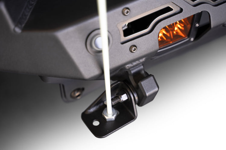 *Please Note: For proper fitment the centerline of the hole in the clevis mount should extend past the face of the bumper. This allows the whip to extend upwards past the bumper.