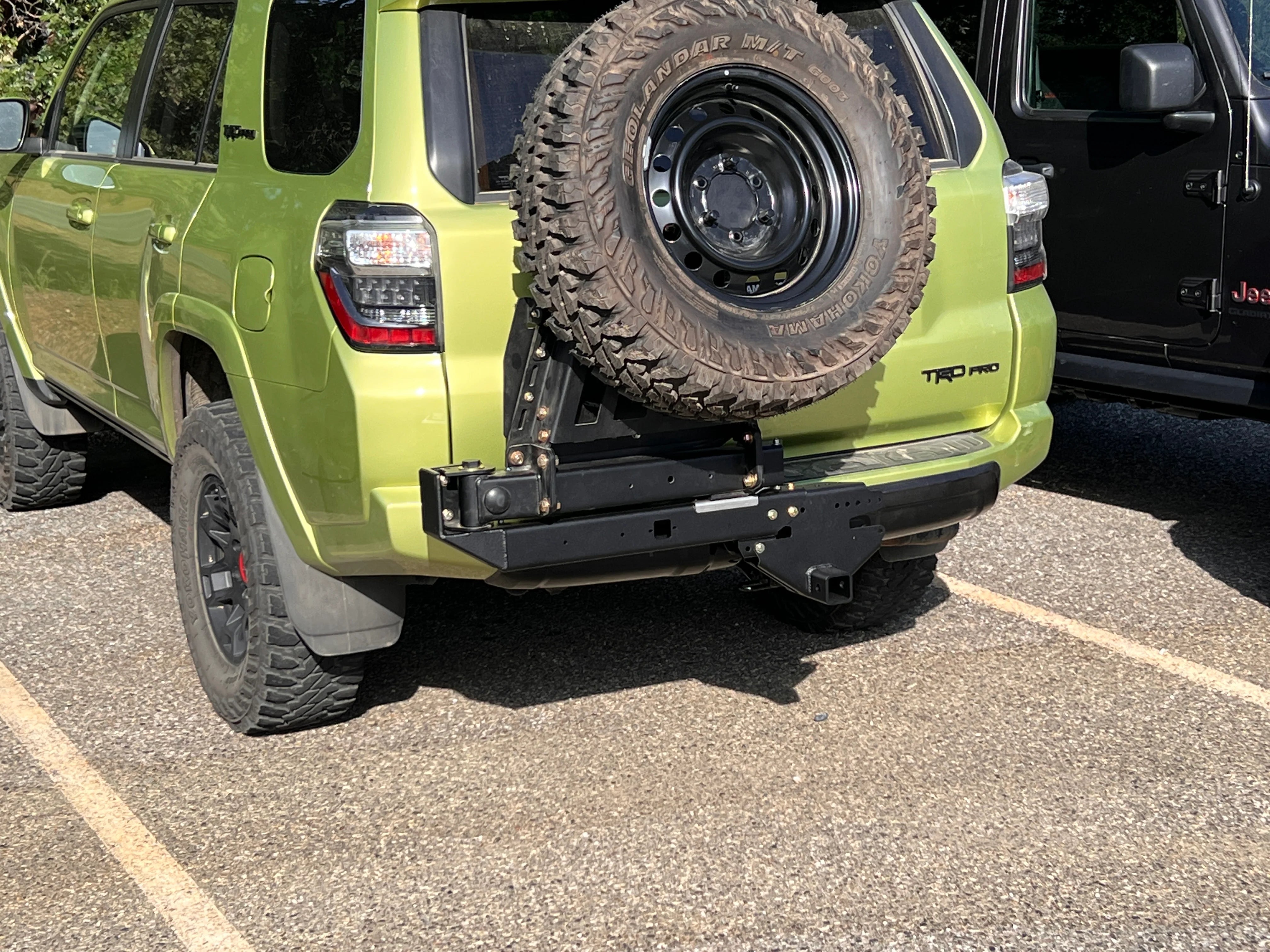 This product is specifically for a single tire carrier swing out on the new hitch mounted system. You can choose to run it on the left or right side and you also have an option to add a flip up table and hi lift jack mount.
