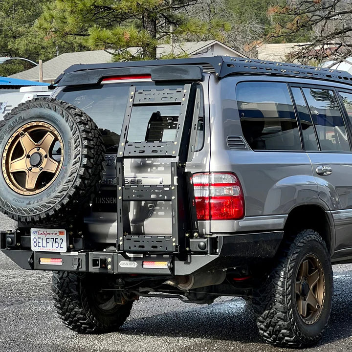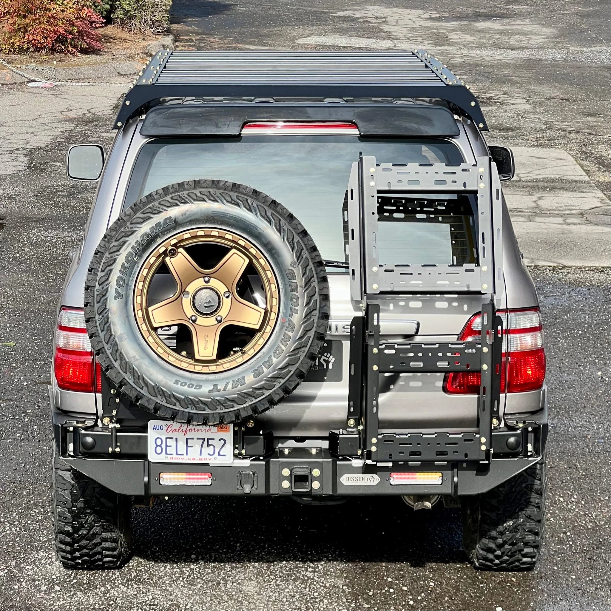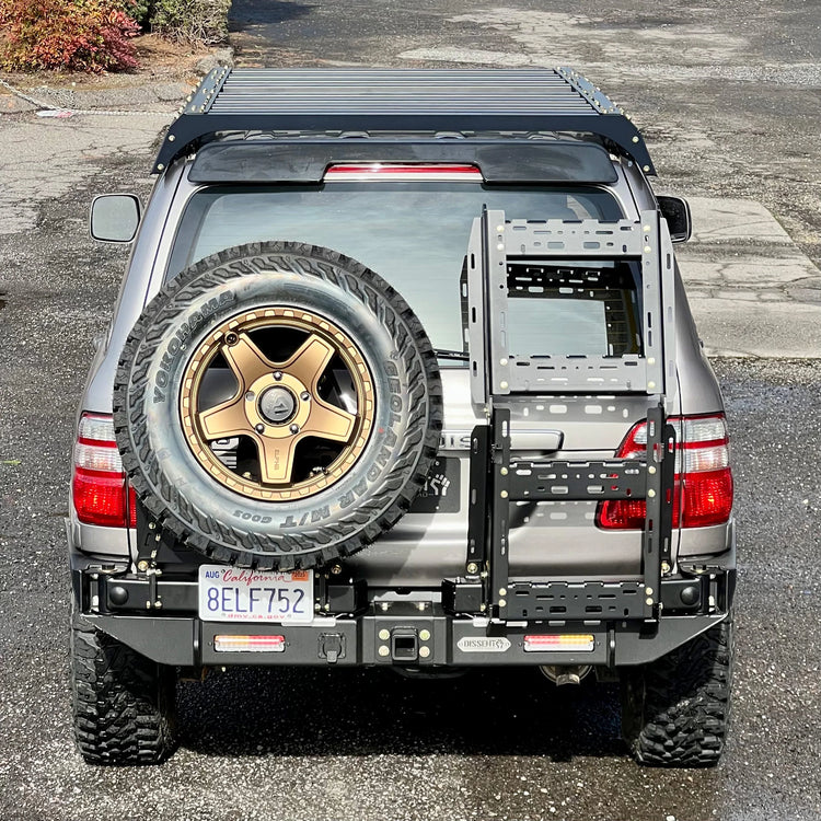 Based on the Overland Panels Swing-out this product replaces the accessory mounting panels with ladder rungs instead. The top half of the swing-out can articulate to match the angle of your rear glass for a real sharp look.