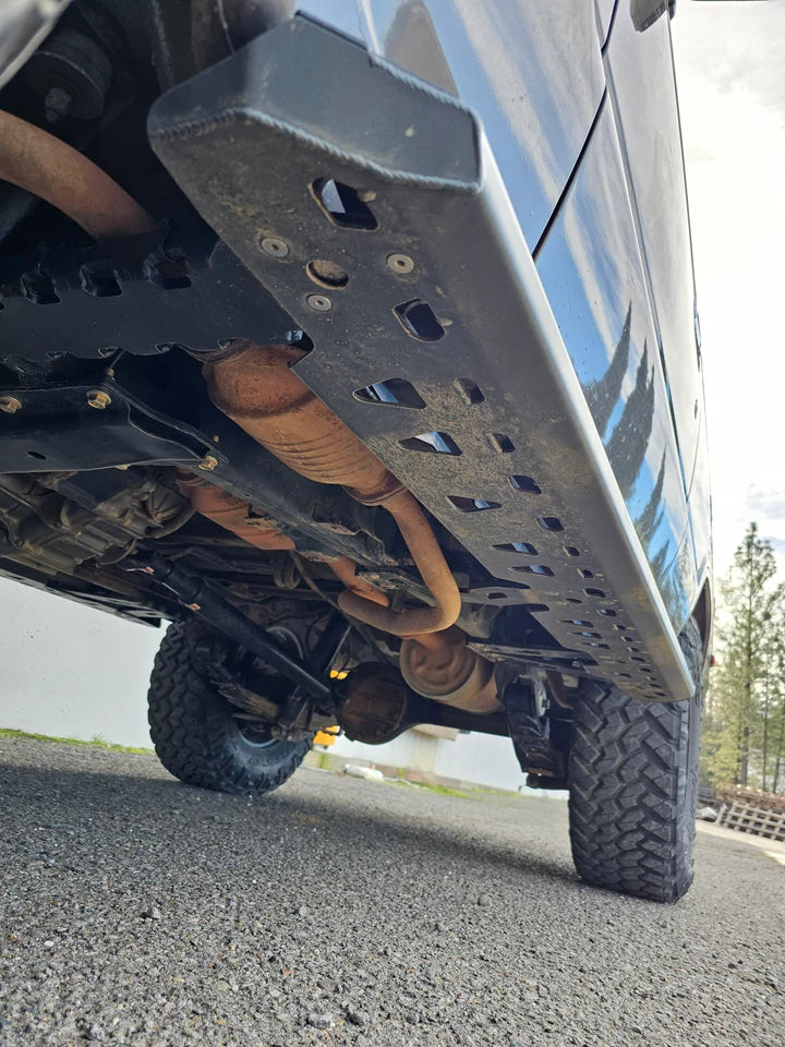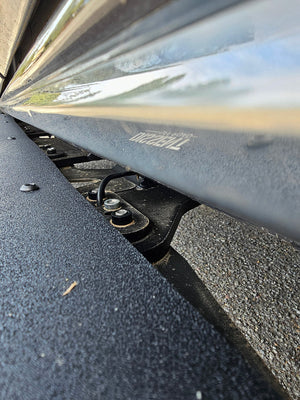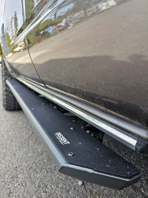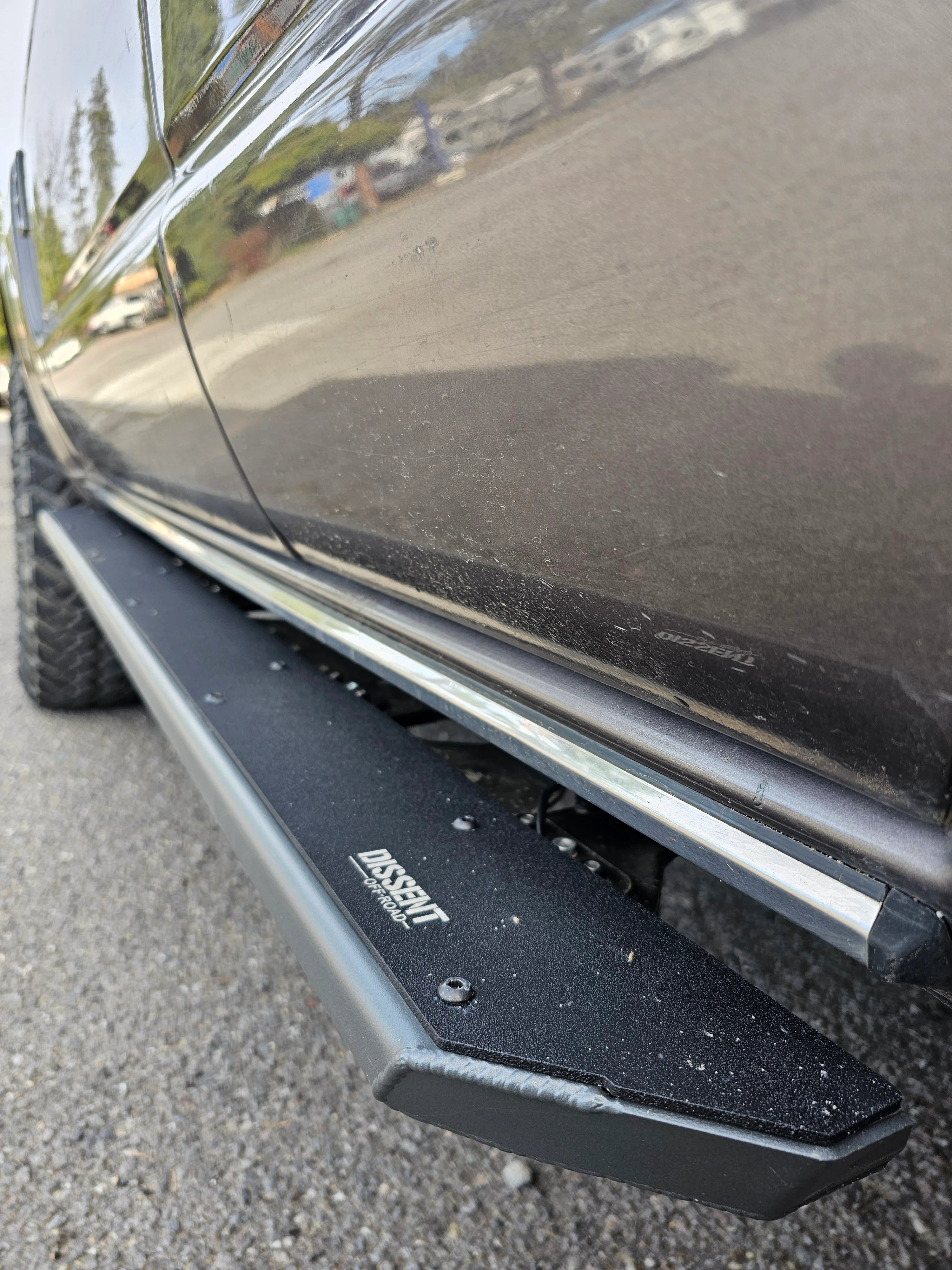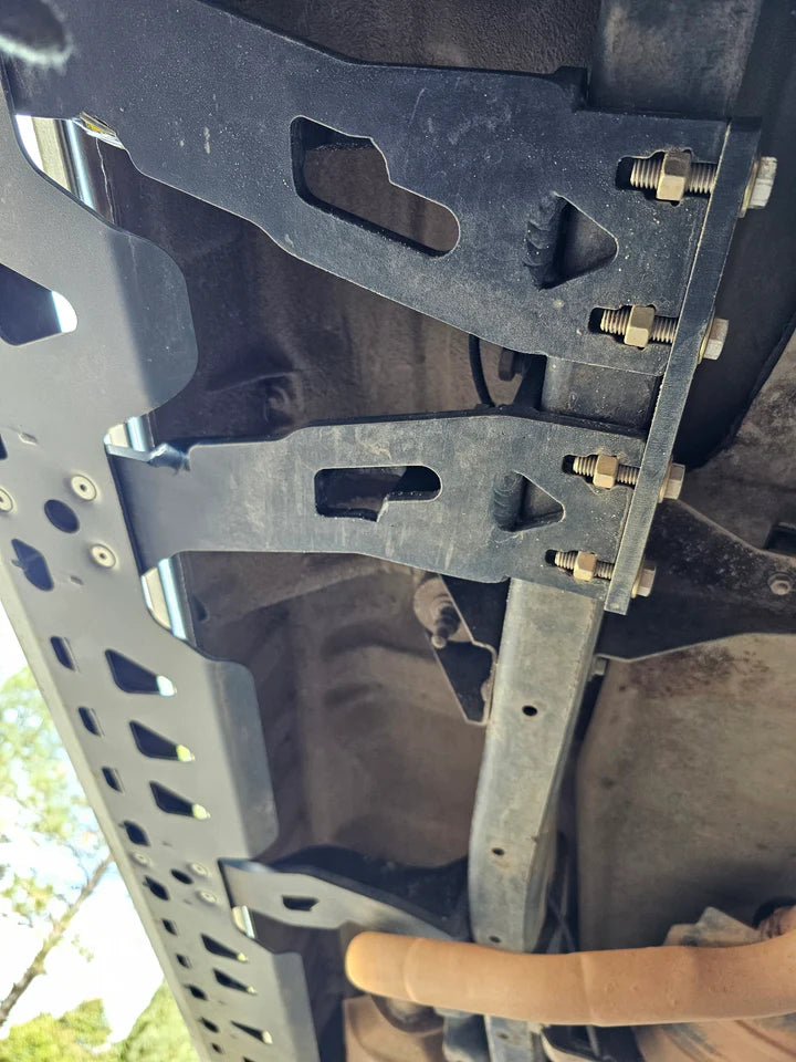 The bodies of our step sliders are made from 10 gauge steel with substantial gusseting to get the required strength without adding too much weight. Our products are designed for tough off-road conditions, which is why we have reinforced our step sliders with four 3/8" thick steel mounting brackets per side with corresponding back plates that both bolt in to existing threaded frame holes and clamp securely around the frame