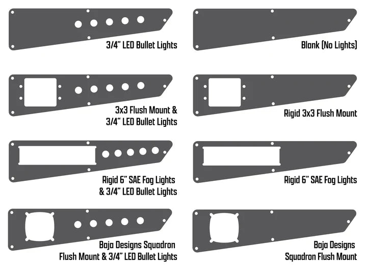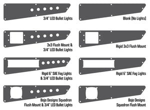 The modular design allows an assortment of auxiliary lighting options inside bumper wings themselves. The bumper wings are covered by a panel called light plates which can be blank (no lights) or they can be cut-out for specific lights with six different options. Check the last image in the photo gallery to see a graphic of the different options