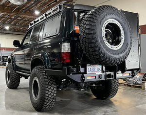 Our most popular swing-out is the Tire Carrier which features a hidden flip-up table and offers adjustability for the tilt angle of the spare plus back and forth to accommodate a range of wheel offsets. The Tire Carrier comes in a Land Cruiser 5-lug and 6-lug version and can be specified either driver side or passenger side. For the U.S. market we find putting the tire carrier on the driver side provides the best visibility if you plan to run dual swings.
