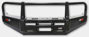Manufactured from high quality structural steel, Dobinsons bull bars are CNC cut, bent and welded for accurate fitment, optimum strength and durability. Features vary by bumper model, but may include: Airbag and winch compatible, Driving light mounts, turn signal (Deluxe and Stainless bumpers only) and parking lights, Heavy duty black powder-coat finish, Dual re-enforced hi-lift jacking points, Dual aerial mounts, Polyurethane bumper overiders (deluxe and Stainless bumpers only), Re-enforced bull-bar wing tips, Separate winch cradle to chassis mounting system allows excess weight and load to be supported directly by the chassis, 3mm Thick Main Body, 4mm + 5mm Thick Bracket, 1.6mm Bash Plates (some models may not come with these), 51mm Upper loops on Classic Black and Classic Black Deluxe (60mm Land Cruiser 200 Series), 76mm center loop and 51mm side loops on Stainless Loop Deluxe models. All bumpers are supplied with a black finish. Stainless Loop Deluxe Bull Bars are supplied with a black finish and stainless steel loops. Some photos show painted bumpers on show vehicles for photography purposes. Color matching can be performed by your local automotive spray painter. Due to the additional weight when fitting a Bull Bar and/or Winch, the vehicle€™s ride height will be lowered. We suggest replacing the springs with a matched pair of springs to suit the requirement. Most bull bars are also equipped with center and side protection plates for the underside of the bull bar. A crucial feature to help protect vital vehicle components when off-road driving. Separate winch cradle to chassis mounting system allows the additional weight of the winch and winching load to be supported directly by the chassis. NOTE: Contact us for accurate information on bumper specifics before ordering if you have questions. Returned shipments will incur additional shipping and handling charges.