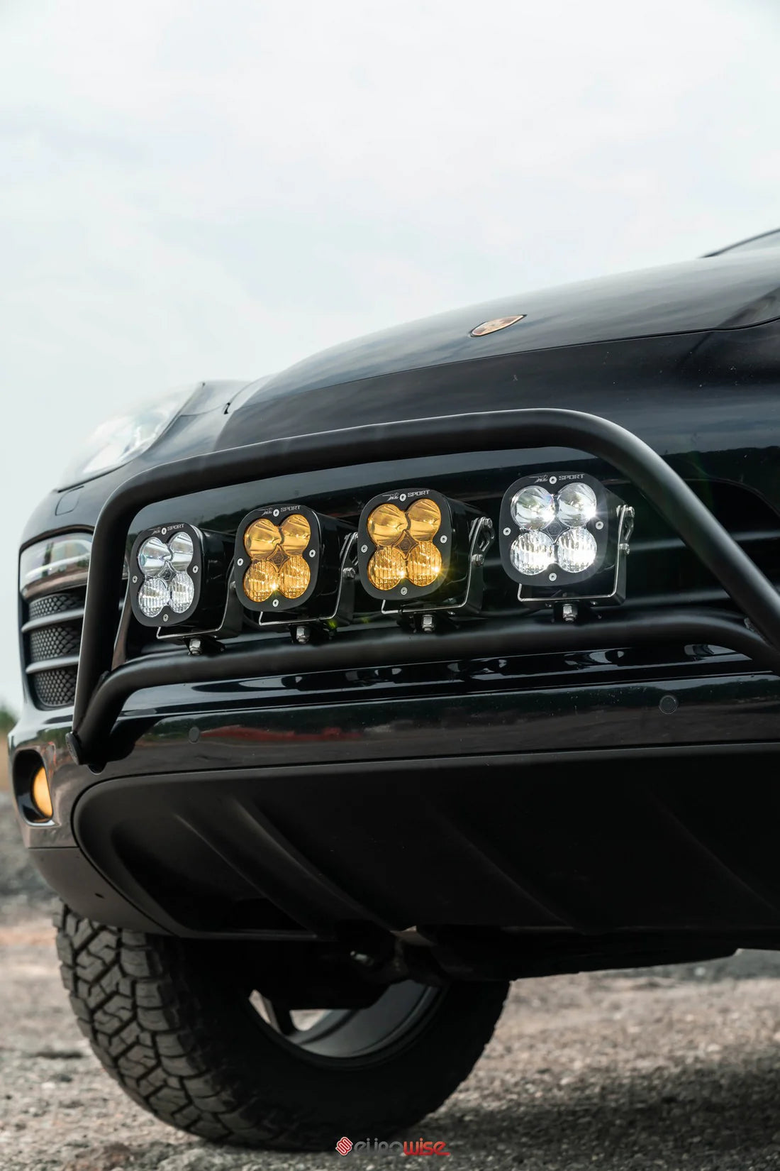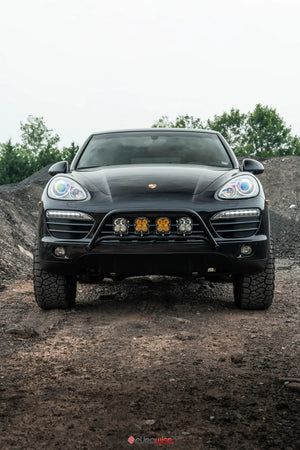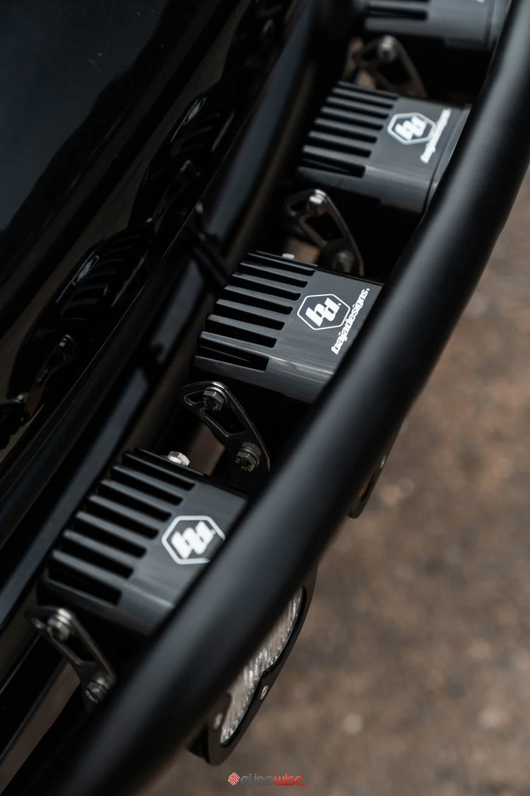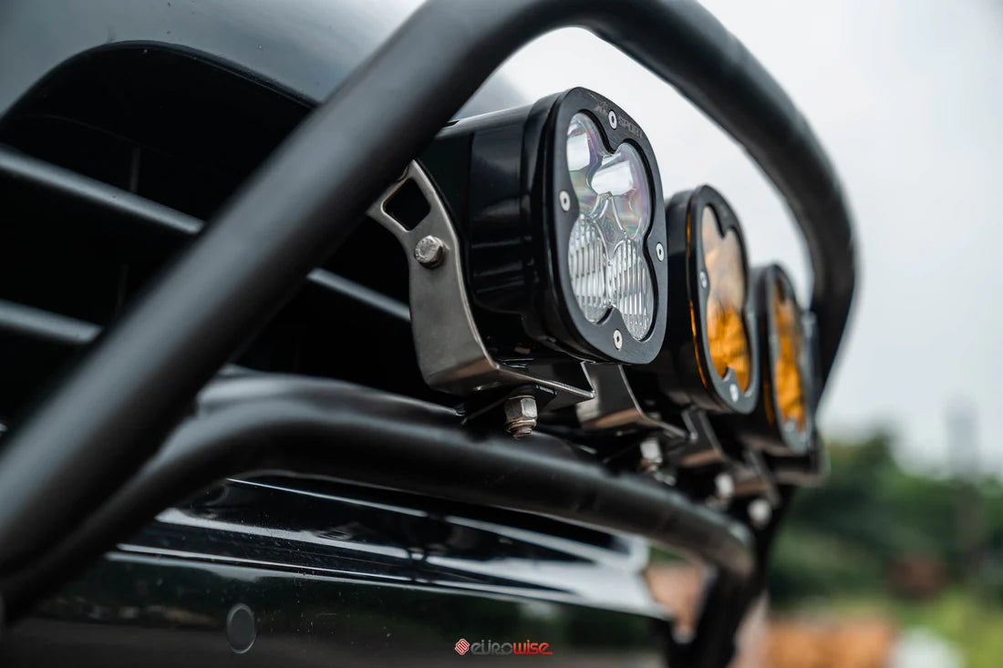Built from 1.5" OD, .120 wall steel tubing with 4 evenly spaced light brackets. Installs in minutes using OE front tow points and transforms the front end of your car. Installation is simple; remove factory tow hook cover, screw on our proprietary mounting bungs, and install light bar with 2 bolts.