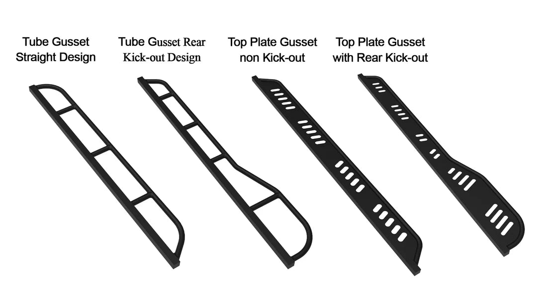 -Steel Tube Gusset Style, Steel Top Plate Welded, Rear Door Kickout with Tube Gussets, ore Rear Door Kick Out Style with Tube Gussets & Top Plate.