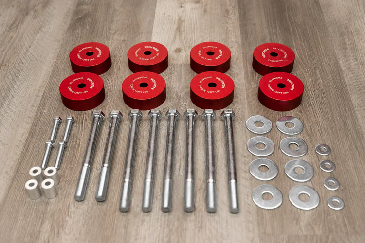 Using 8 anodized billet spacers and extended hardware, both the front and rear subframes are lowered. We recommend a 1" drop with 2.5 to 3.5 inches of lift and include it with purchase of all our 3" lift kits.