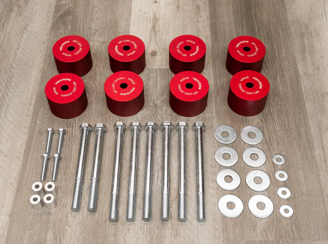 Using 8 anodized billet spacers and extended hardware, both the front and rear subframes are lowered. We recommend a 2" drop with 4.5+ inches of lift.