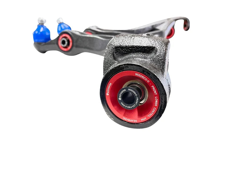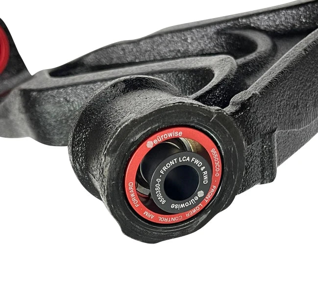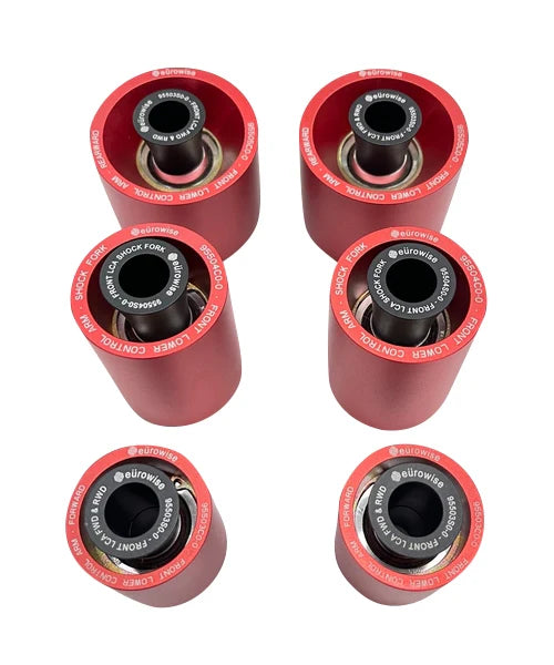 Eurowise's ultimate performance solution to the problematic OEM rubber control arm bushings on Gen 1 & Gen 2 Cayennes, Touaregs, and Q7 front lower control arms.