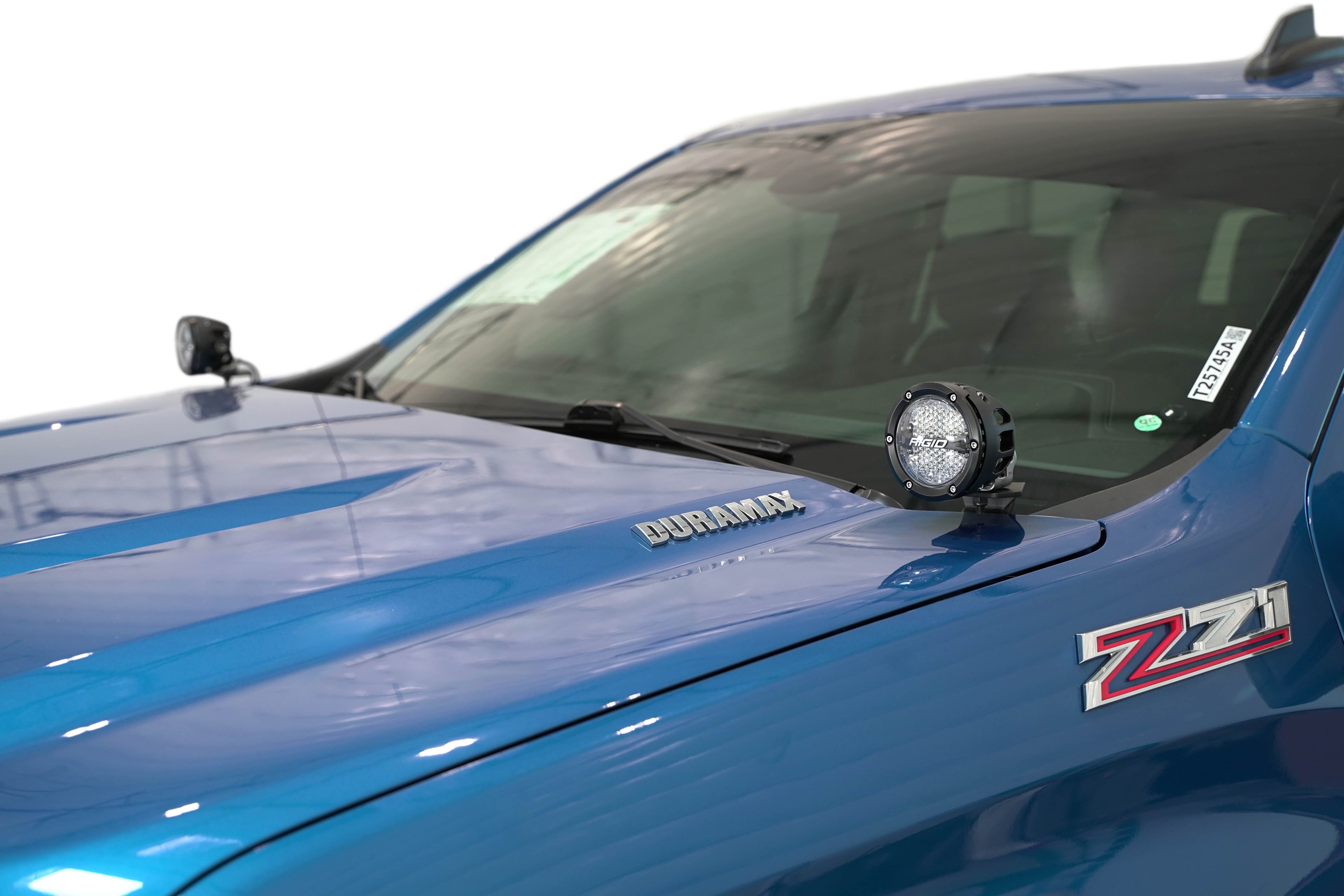 These light brackets mount in a low profile position to both the driver and passenger side hood hinges of the 2022+ GMC Sierra or Chevy Silverado 1500; keeping them out of your sightlines. They can be oriented forward or off to the side to be used as ditch lights. Capable of mounting a single 3-inch cube light on up to a 6-inch round light on each side, they maintain rigidity on or off the road. The light brackets were designed for clean wire management. Made from 3/16-inch American steel and finished in a durable 2-stage hammer black powder coat, these are fully bolt-on and Made in the USA.