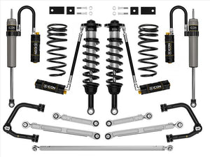 The ICON Vehicle Dynamics Stage 11 complete suspension system for the 2022-2023 Toyota Tundra builds upon the Stage 10 system with the addition of triple rate rear coils springs and an adjustable rear track bar. This system offers improved on- and off-road performance with adjustable compression damping, as well as improved alignment specs and increased front and rear-end lift height range for a proper stance and fitment of up to 35" tires. To compliment the rear coils and track bar, a 2.5 Series CDCV remote reservoir front coilover shock and billet aluminum front upper control arm combo is included along with a front sway bar drop kit and 2.5 Aluminum Series CDCV rear remote reservoir shocks with billet upper and lower rear links.