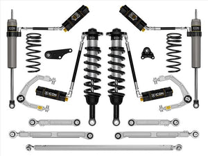 ICON tubular upper control arm kit is designed to improve the overall performance of the new 2024 Toyota Tacoma with corrected front-end geometry, built in additional caster, and improved suspension component clearance. Replacing the OE ball joint with the all-new, serviceable, and rebuildable ICON Delta Joint PRO allows for full bump and droop travel of the front suspension while eliminating bind. The rear triple-rate coil design provides a softer droop and ride rates with a firmer overload rate that combine to deliver on-road comfort with excellent bottoming resistance and superior off-road performance. ICON tubular rear upper and lower links employ dual-durometer greaseless bushings at one end, and massive FK rod ends at the other to provide the best combination of free articulation while isolating and damping road noise and vibrations. The ICON Billet Adjustable Rear Track Bar helps re-center the rear axle and double adjuster rod end threads allow easy “on-vehicle” fine adjustment of track bar length without requiring removal or disassembly of the track bar. ICON 2.5 Aluminum Series CDCV remote reservoir rear shocks with integrated bump zones provide improved shock damping ability and utilize a vehicle-specific valving that balances the performance of the truck from front to rear. The ICON Vehicle Dynamics 2024 Toyota Tacoma Stage 11 suspension system is an excellent choice for those drivers looking to enhance the capabilities of their pickup on the road as well as in the dirt.