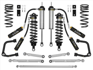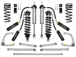 The ICON Vehicle Dynamics Stage 3 3.0 complete suspension system for the 2022-2023 Toyota Tundra builds upon the Stage 2 3.0 suspension system with the addition of triple rate rear coils springs and an adjustable rear track bar. To compliment the coils and track bar 3.0 Series CDCV front coilovers are included along with tubular steel front upper control arms, a billet rear upper/lower link combo, a front sway bar drop kit, and 3.0 Series CDCV rear shocks. This system offers improved on- and off-road performance with adjustable compression damping, as well as improved alignment specs and increased front-end lift height range for a proper stance and fitment of up to 35" tires.