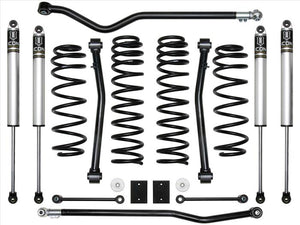 The ICON Vehicle Dynamics Stage 3 2.5" Suspension System for the 2018-UP Jeep Wrangler JL is designed for the driver looking to drastically improve the performance and ride quality of their vehicle. This Stage 3 system includes 2.5" lift dual rate coil springs, Vehicle Specific 2.0 Aluminum Series shocks, adjustable front upper links, tubular steel front lower links, adjustable front and rear track bars, bump stop spacers, sway bar links, and all necessary hardware to complete the installation. With this combination of components, ICON was able to increase wheel travel numbers by over 30% (3" front, 2" rear), redefining the potential of the 2018-UP JL. The front lower links included with this system are constructed from thick wall steel tubing, provide increased castor numbers, and feature dual durometer bushings for noise free operation, maximum articulation, and minimal bind. The Stage 3 system allows for fitment of 35" tires when used with ICON's recommended wheel specifications. For users looking to install 37" tires, an optional bump stop spacer kit (PN: 22029) is available.