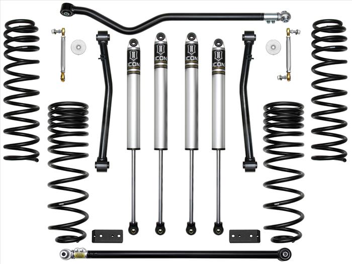 The Stage 4 ICON 2.5” Suspension System for the Jeep Gladiator is the ideal setup for drastically improving on-road ride quality and overall performance for the daily driven application that will see frequent, moderate off-road use. This complete suspension system features 2.0 Aluminum Series shocks, 2.5” lift dual-rate front coil springs, a tubular steel fixed front lower link kit, billet front sway bar links, a triple-rate rear coil spring kit, a rear sway bar relocation kit, front and rear adjustable track bars, and all necessary hardware for install. This system provides an increase of over 30% front and 20% rear wheel travel and was designed around the use of a 35” tire. For those looking to run a 37” tire this can be achieved with the ICON Jeep JT Bump Stop Spacer Kit (Part #22071).