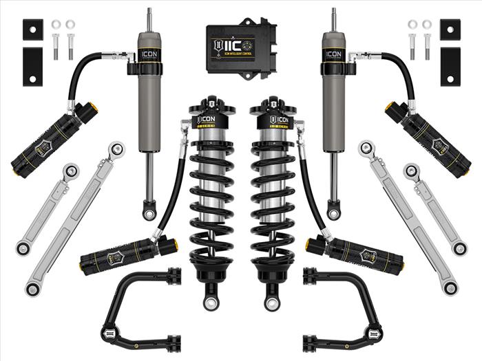 The ICON Vehicle Dynamics Stage 4 3.0 complete suspension system for the 2022-2023 Toyota Tundra builds upon the Stage 1 3.0 suspension system with the upgrade to CDEV and ICON Intelligent control (IIC) for in vehicle, active compression damping adjustment. To compliment the 3.0 Series coilover shocks, 2.5 Aluminum Series CDEV rear remote reservoir shocks are included along with billet aluminum front upper control arms and a billet rear upper/lower link combo, and a front sway bar drop kit. This system offers improved on- and off-road performance with adjustable compression damping, as well as improved alignment specs and increased front-end lift height range for a proper stance and fitment of up to 35" tires.