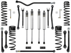 The Stage 5 ICON 2.5” Suspension System for the Jeep Gladiator is the ideal setup for significantly improving off-road performance and overall ride quality for the application that will see frequent moderate off-road use. This complete suspension system features 2.0 Aluminum Series shocks, 2.5” lift dual-rate front coil springs, tubular steel fixed lower and adjustable upper front links, billet front sway bar links, a triple-rate rear coil spring kit, tubular steel fixed upper and adjustable lower rear links, a rear sway bar relocation kit, front and rear adjustable track bars, and all necessary hardware for install. This system provides an increase of over 30% front and 20% rear wheel travel and was designed around the use of a 35” tire. For those looking to run a 37” tire this can be achieved with the ICON Jeep JT Bump Stop Spacer Kit (Part #22071).