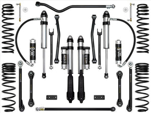 The Stage 7 ICON 2.5” Suspension System for the Jeep Gladiator is the ideal setup for drastically improving off-road performance and overall ride quality for the application that will see frequent heavy off-road use. This complete suspension system features ICON’s proven 2.5 Aluminum Series shocks, 2.5” lift dual-rate front coil springs, tubular steel fixed lower and adjustable upper front links, billet front sway bar links, a triple-rate rear coil spring kit, tubular steel fixed upper and adjustable lower rear links, a rear sway bar relocation kit, front and rear adjustable track bars, and all necessary hardware for install. This system provides an increase of over 30% front and 20% rear wheel travel and was designed around the use of a 35” tire. For those looking to run a 37” tire this can be achieved with the ICON Jeep JT Bump Stop Spacer Kit (Part #22071).