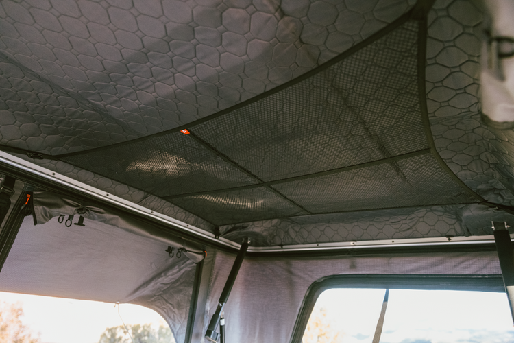The Premium Overhead mesh hammock was designed to hold things like an extra blanket, your sweater, or items that you just don't want to have to deal with while you sleep. It attaches at 4 points on the ceiling of the tent and helps keeps things clean and tidy.