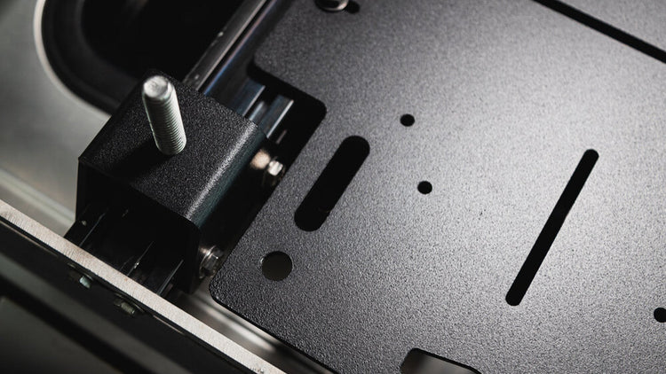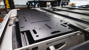 A mounting panel that doubles as a platform for your rack. With many different mounting holes, this is ready to mount up whatever you want on your roof. This plate features mounting locations for RotoPax, NMO antennas, various tie-downs, in addition to multiple sliding tracks positioned throughout. These are 12" wide.
